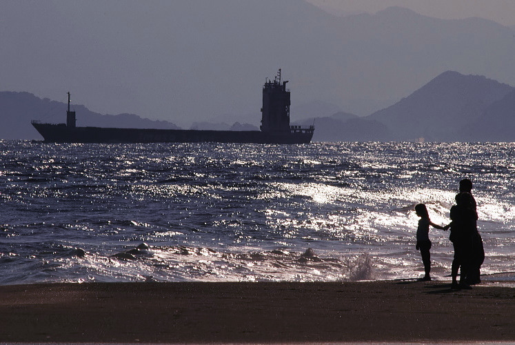 海峡を通る貨物船。