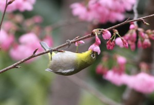 ボケの花にヒヨドリが来ました。ちょっとピンボケでした。