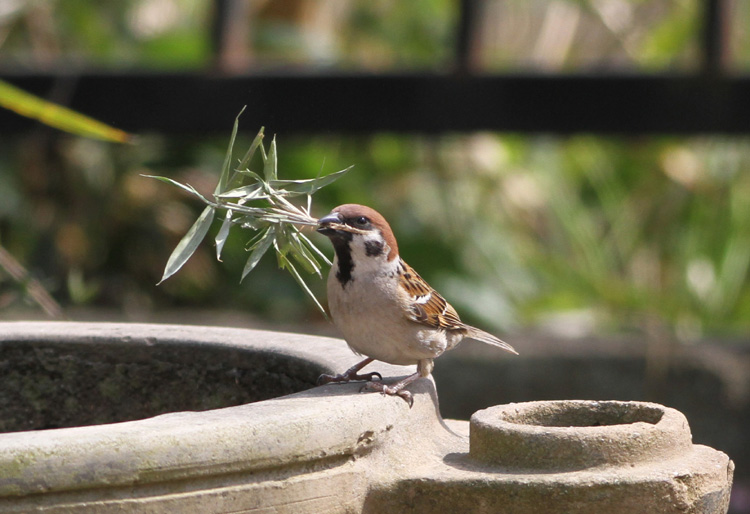 巣材をくわえたスズメがちょっと大きすぎるなと悩んでおりました。