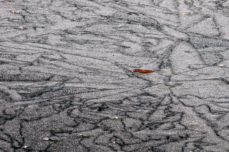 氷った池に落ちていて、氷に閉じ込められた落葉です。 遊び相手もなく寂しそう。