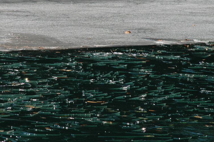 風や流れで割れた氷が波のように並んでいます。 寒いダム湖の一こまです。