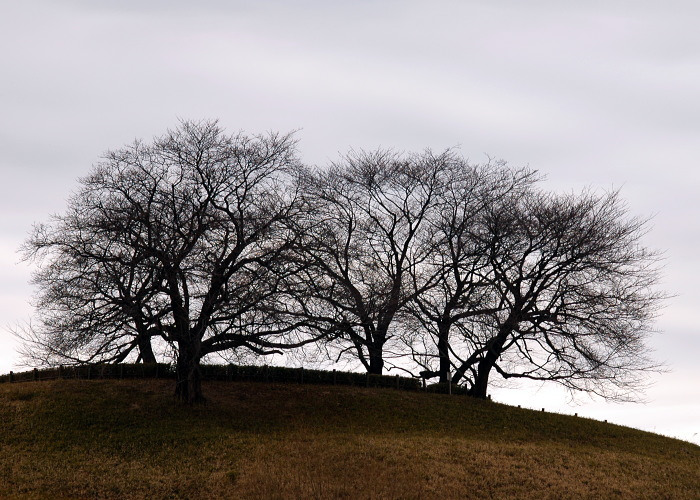 ある古墳公園の大きな古墳の上に数本の木が植わっています。 回りが剥げているので冬枯れの木は寒そうです。