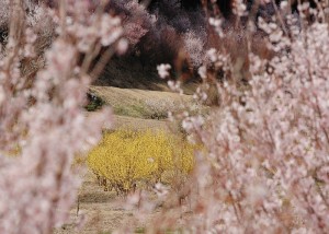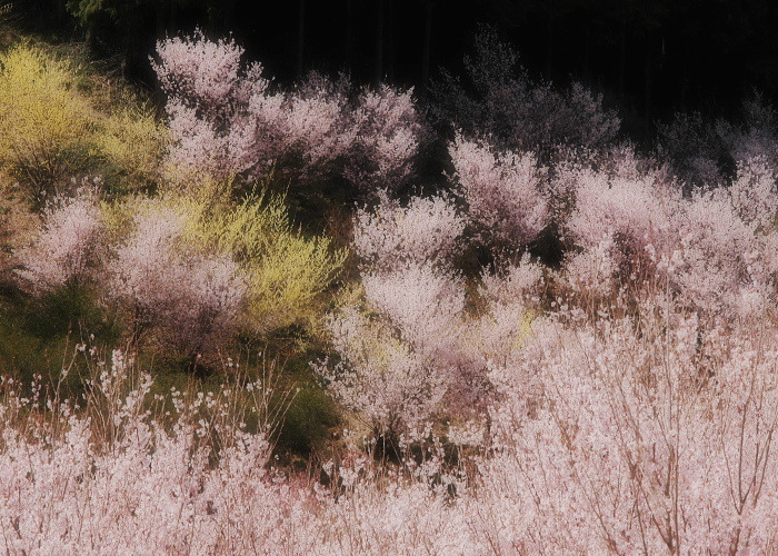 ここは花木の切花用の植物を育てている所です。 桜のころ、ここは桃源郷となります。 PC内でソフトフォーカスをかけています。