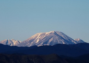 冬の日光男体山を遠くから超望遠で引き寄せました。 手前の山の尾根が暗いのが味噌です。