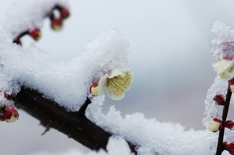 今年は暖冬で梅も早く咲き始めましたね。そしてこの雪です。梅の花も驚いたでしょう。「どうなるの?」と、でも一瞬のことでした。午後には雪はすっかり解けてしまいました。