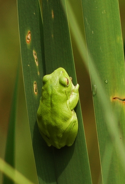 谷津田の休耕田に蒲が生えていました。その葉の途中にちょこんとシュレーゲルアオガエルが貼り付いていました。