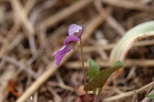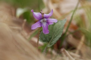 ただ一輪見つけたサクラスミレ。残念ながら花弁が虫にかじられていました。