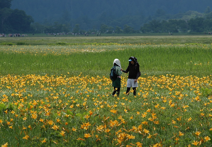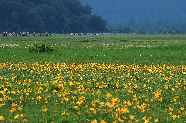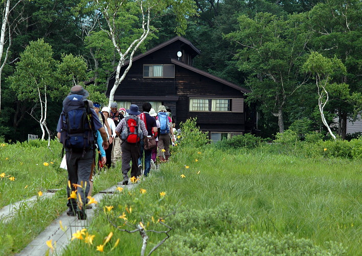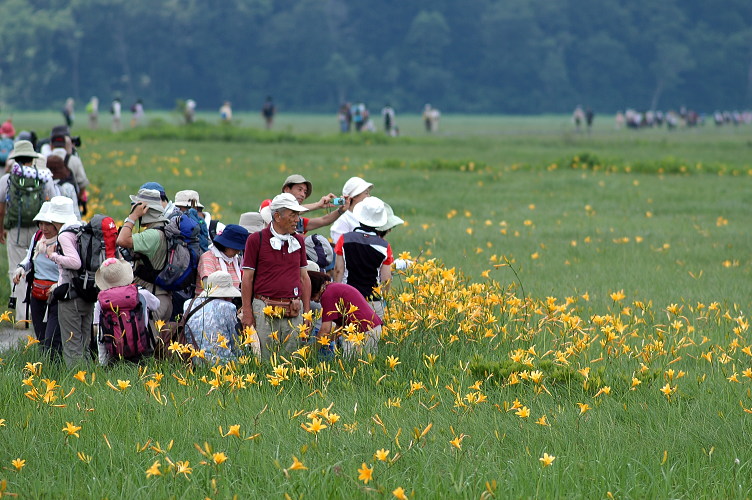 今が盛りのニッコウキスゲの中をハイカーは進みます。最近はやりの山ガールも沢山いました。