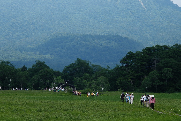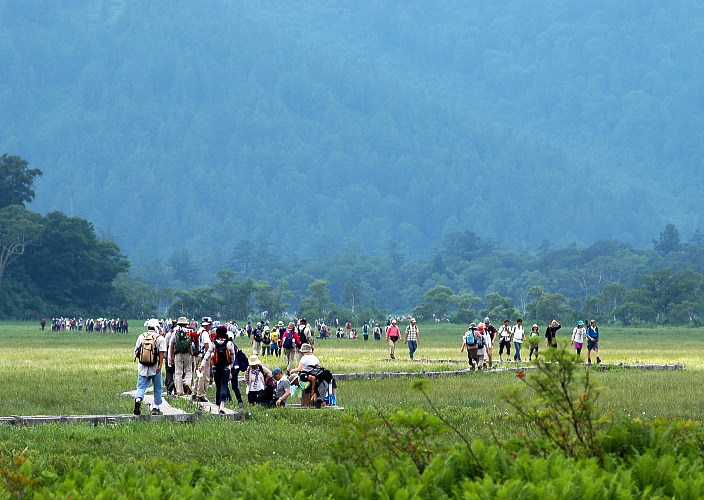 尾瀬ヶ原の真ん中を歩く沢山のハイカー