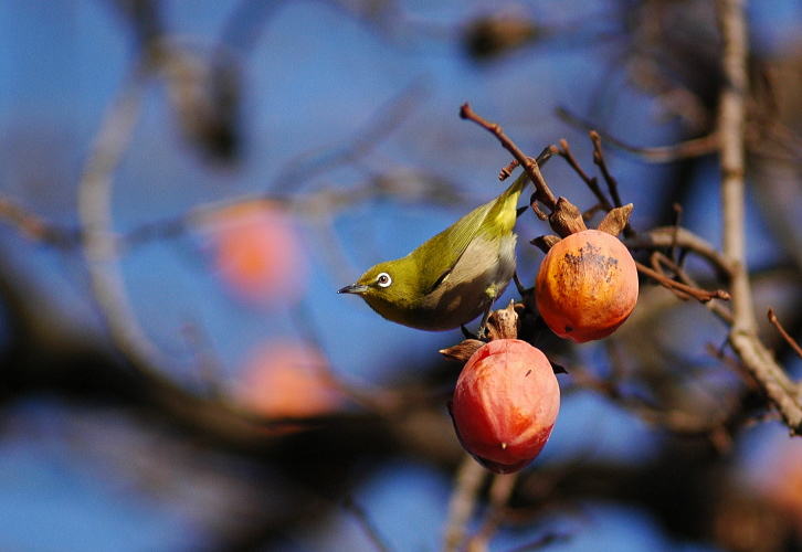 柿の実が熟れてきました。色々な小鳥が食べに来ますが、メジロの数が一番多いようです。