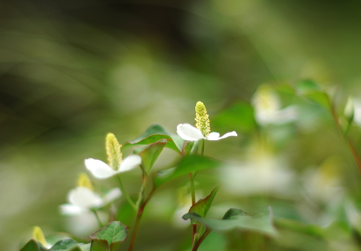 ドクダミはなかなか絵にならない花です。何か工夫しないとちっとも面白くありません。だから今回は前ボケ後ボケを使ってみました。2枚目はかくれんぼをするように葉のかげから。