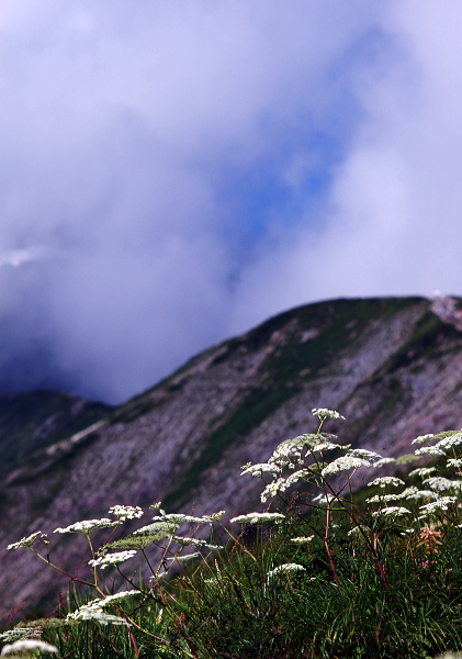 セリ科の花でも、バックにこのように雪のある高山の岩山をバックにすると絵になるものです。これはおそらくミヤマトウキだと思います。
