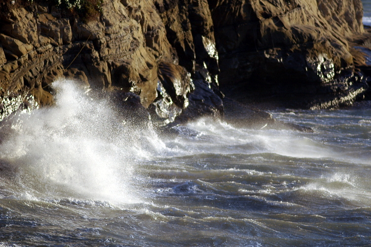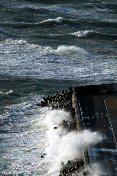 強い風に翻弄され、岩や堤防に砕ける波。