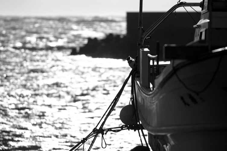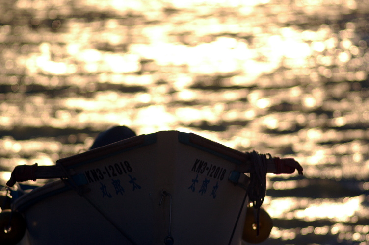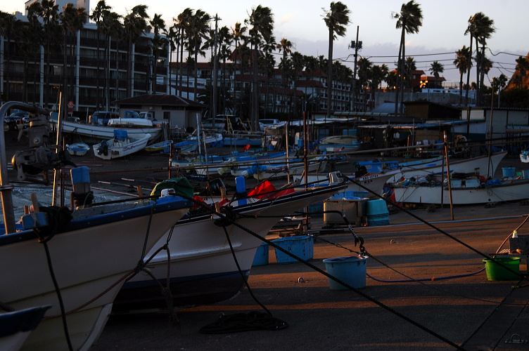 この日の風は尋常ではなかったのでさすがに漁船も出漁していませんでした。係留されているか、このように丘にあげられていました。小坪漁港にて。 夕日にきらめく波をバックに