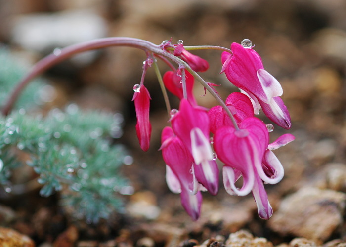 高山植物の女王とまで言われるコマクサですが、父さんの写真の目線は花についた雫にいってしまいました。