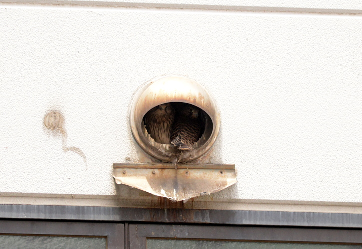 チョウゲンボウがこんなところで繁殖しています。2羽の雛が見えますね。中にまだいるのでしょうか。
