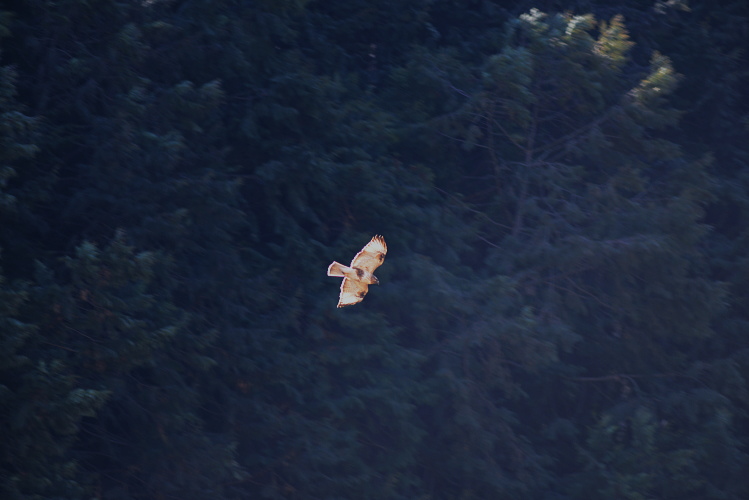 私の気付いたのでしょうか、ノスリが森陰から飛び立ちました。丘陵地の森の上ろゆっくりを上昇していきました。