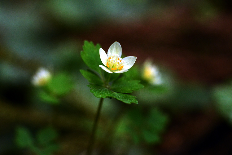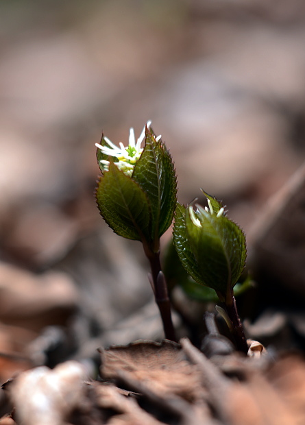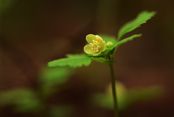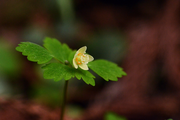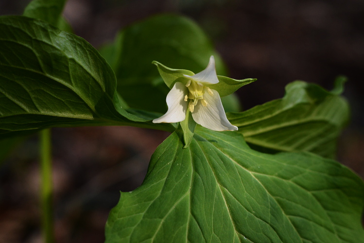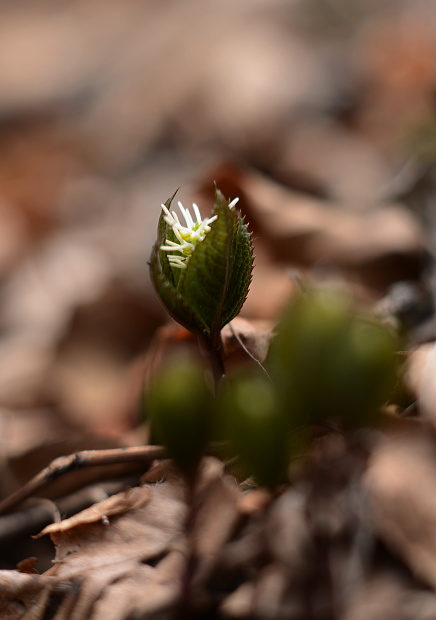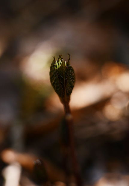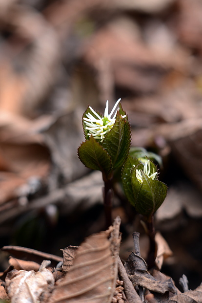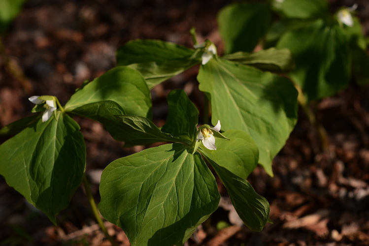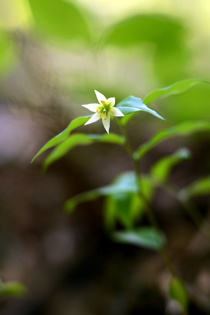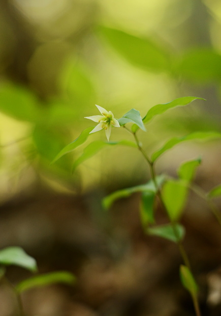 春の雑木林にはよく光がさします。夏には暗くなってしまいそうな場所でも、明るいこの時期チゴユリは群生します。横から下を向いて咲く姿はなかなかけなげで可愛いです。