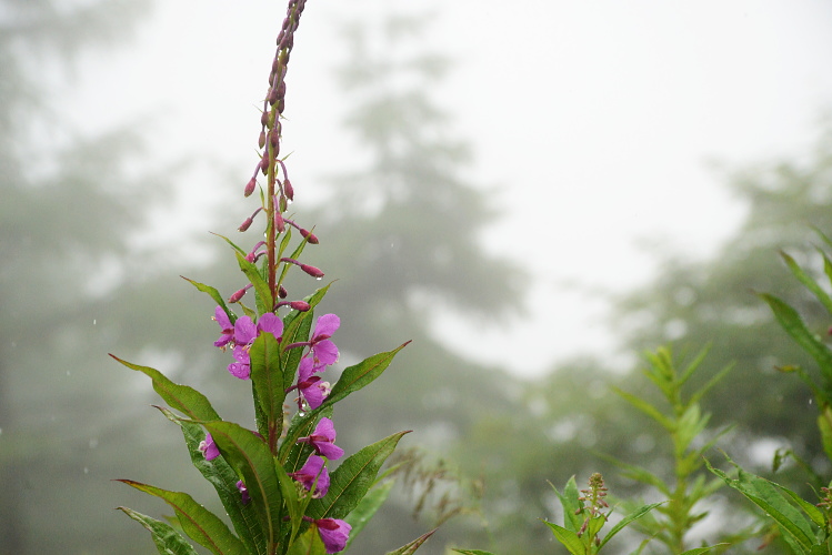 霧雨の中、水滴が滴るヤナギラン。