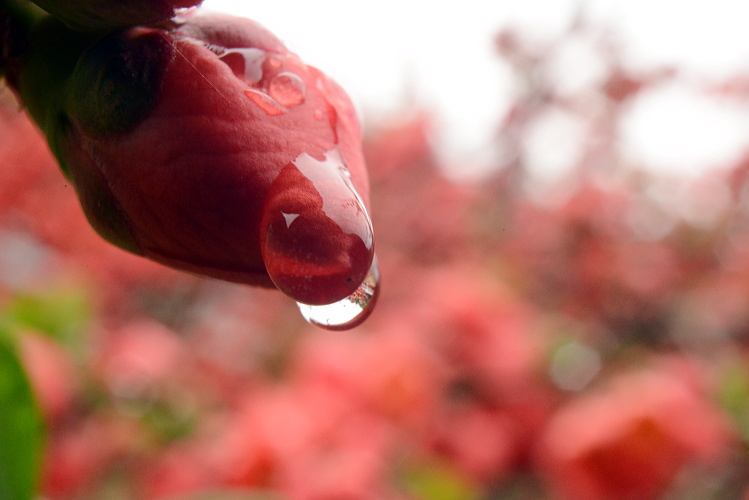 黄色いサンシュユに雫がたまります。雫の中にもサンシュユが。