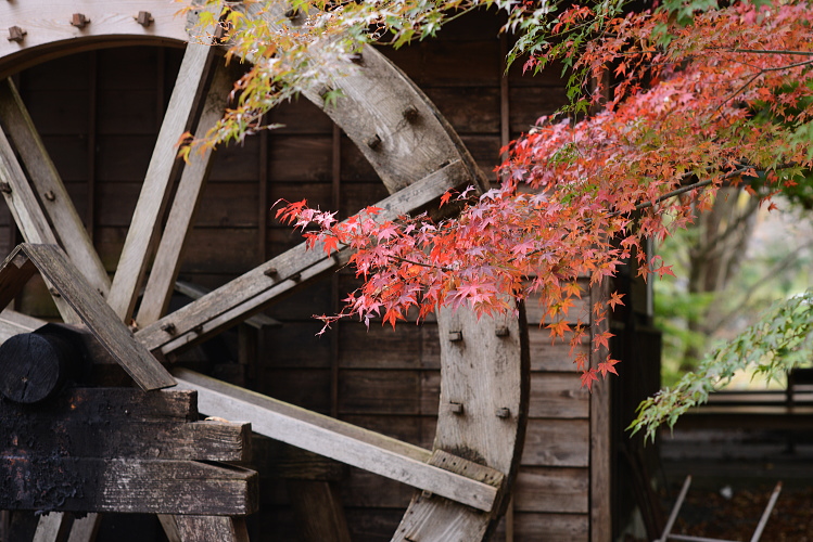 もちろん観光用の水車ですが、もみじとの対比が日本的で面白い。