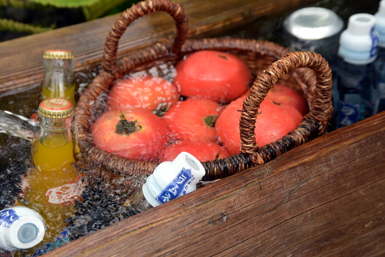 いかにも涼しげな湧水で冷やされているトマトやラムネ。