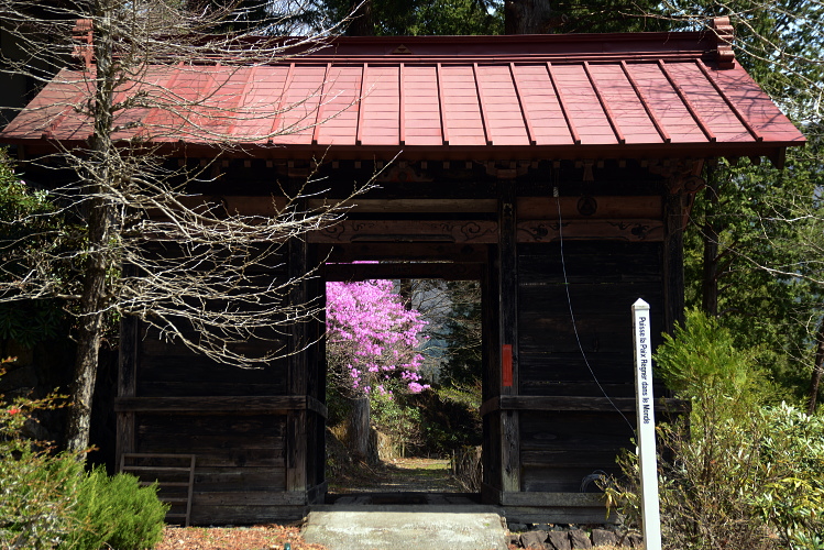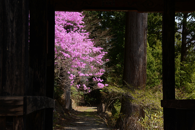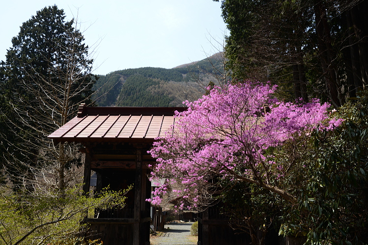 大陽寺の仁王門の前には大きなミツバツツジがあります。そのミツバツツジと仁王門のセットです。
