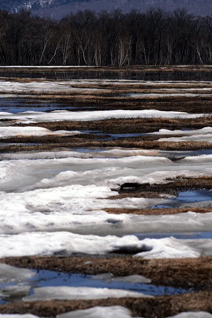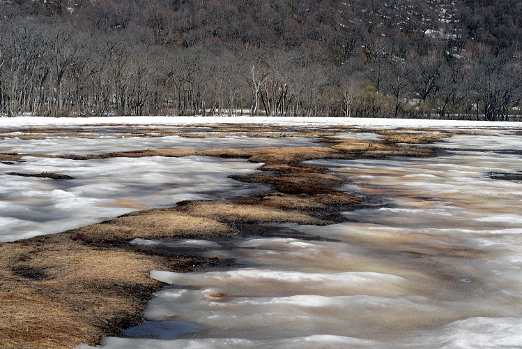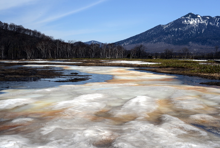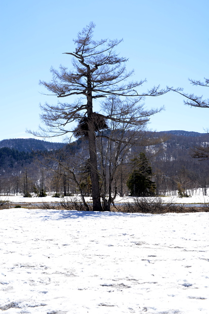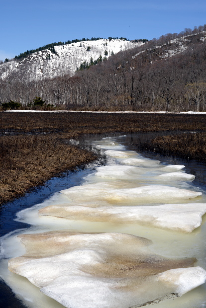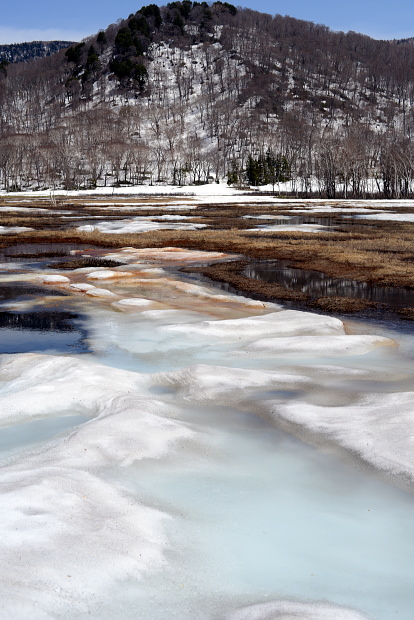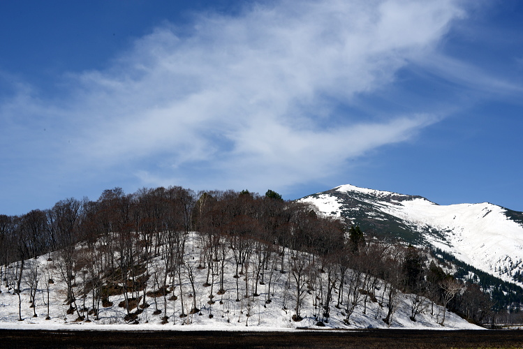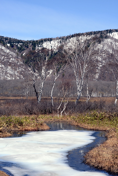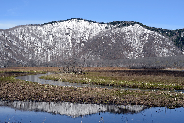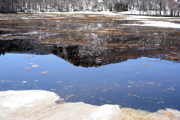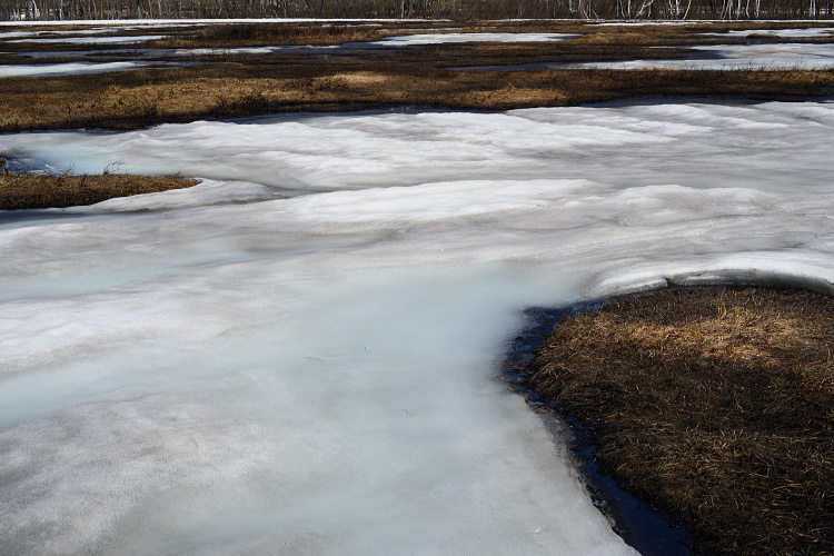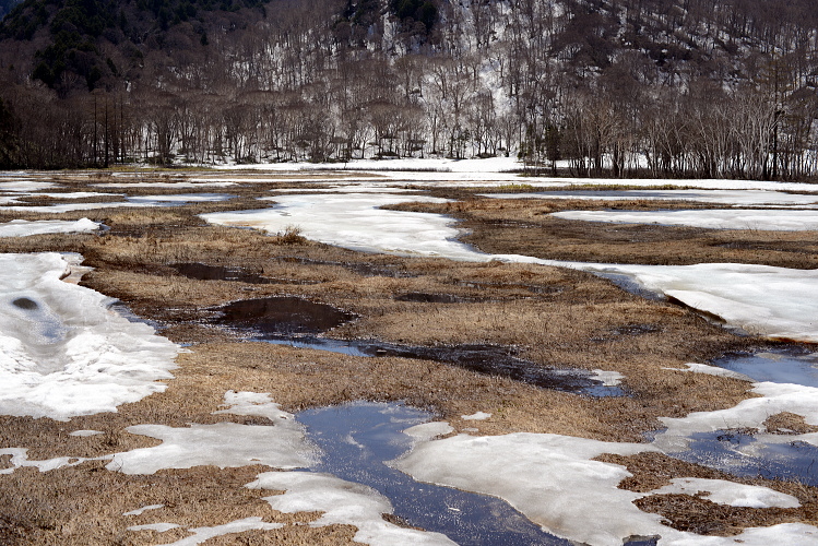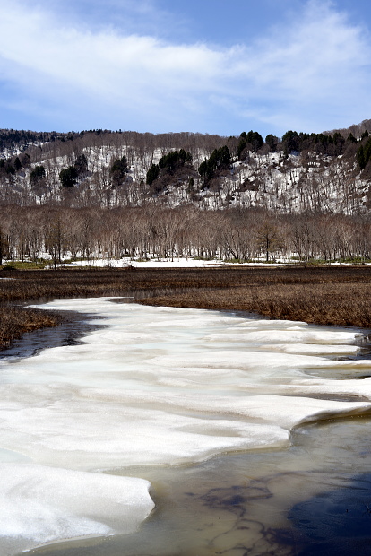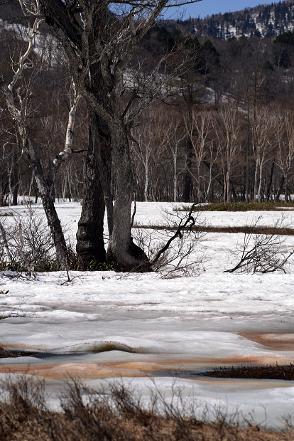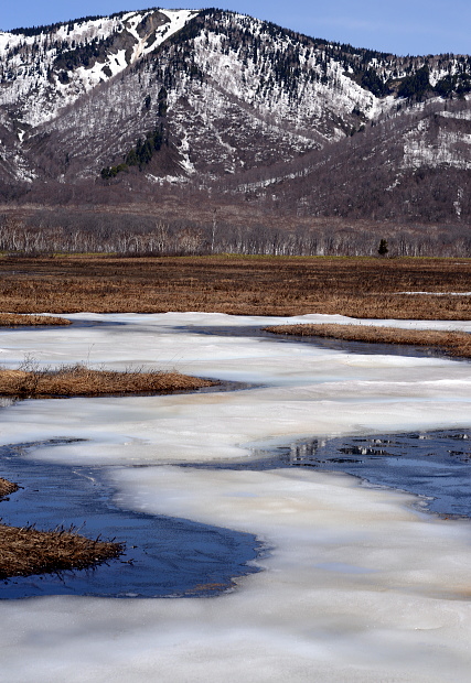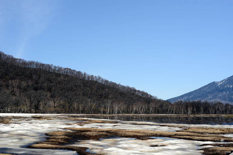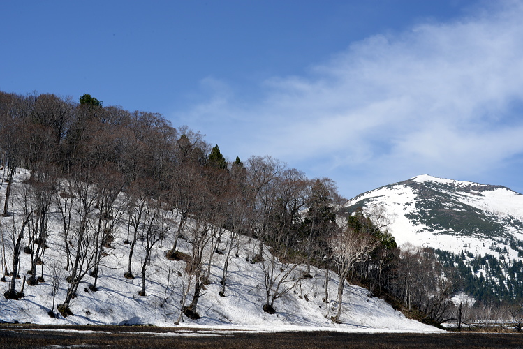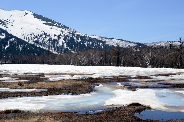 尾瀬ヶ原と言っても、雪解けは一様ではなく雪原として残っているところと、まさに融け終わろうとするまばらな所と、すっかり溶けてしまったところと色々です。ここでは雪原がまだ残っているところとその周辺の山の写真です。