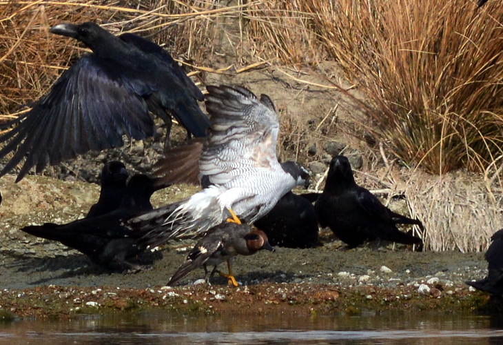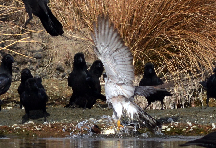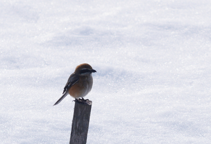 雪の後、ぽつりとモズが杭にとまっていました。この大雪では餌も探せないでしょうに。