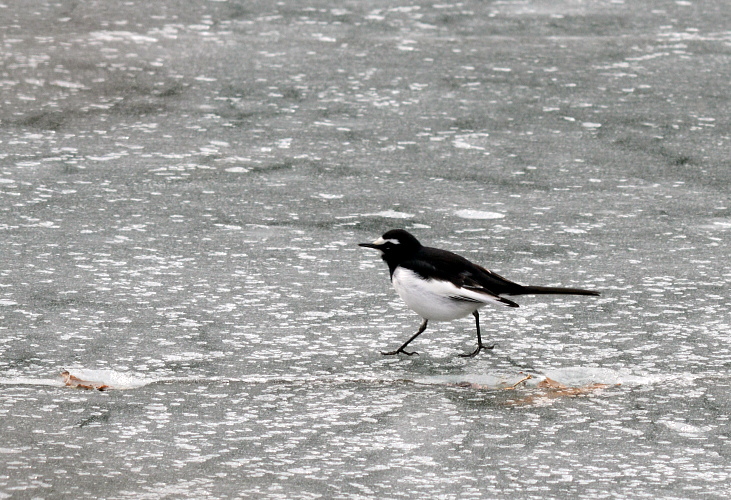 池の氷の上のセグロセキレイ。ひょこひょこ歩きます。