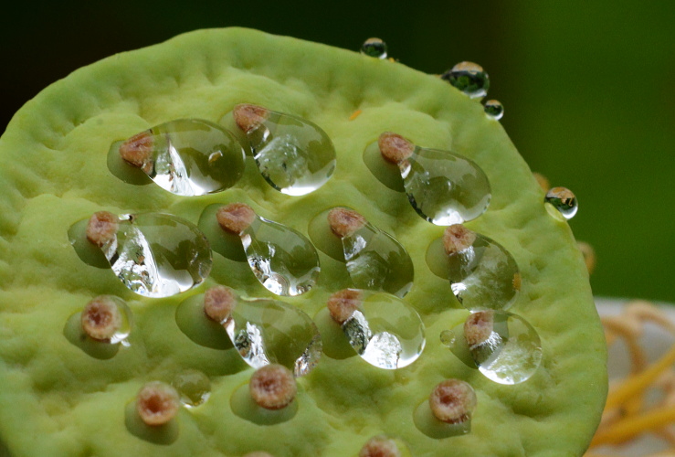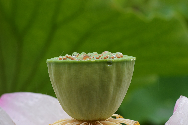 雨はハスを生き生きとさせます。特に葉は雨粒が好きなように思います。まるで宝石をまとっているようです。