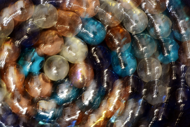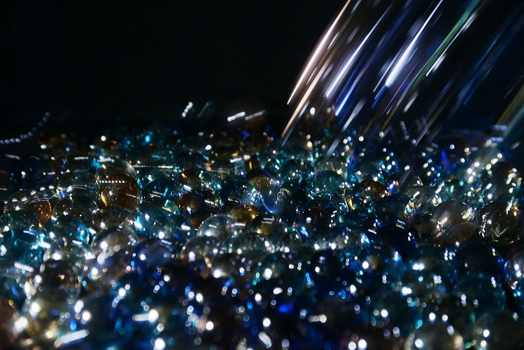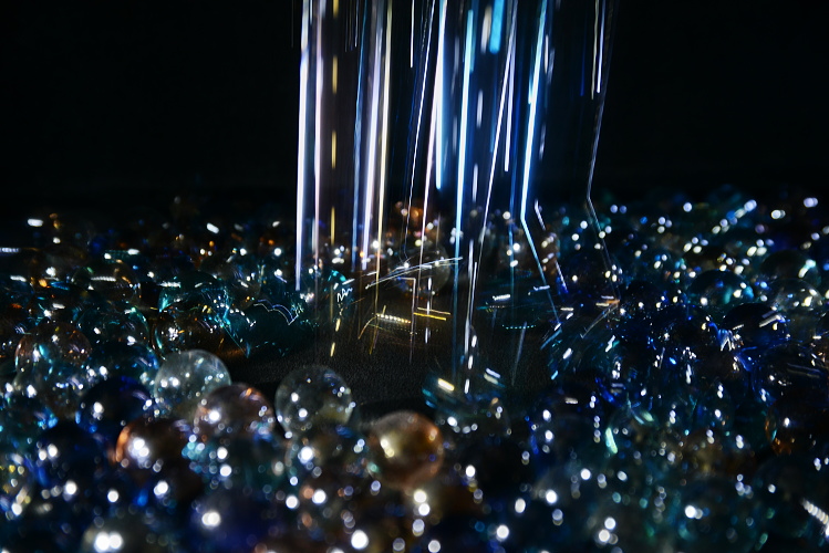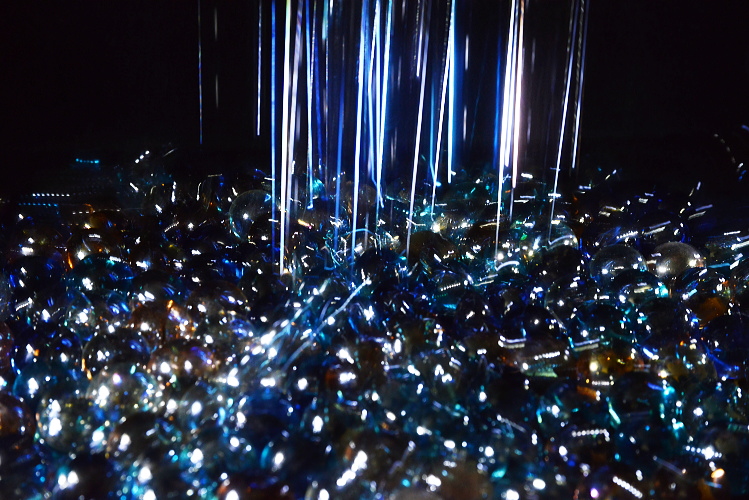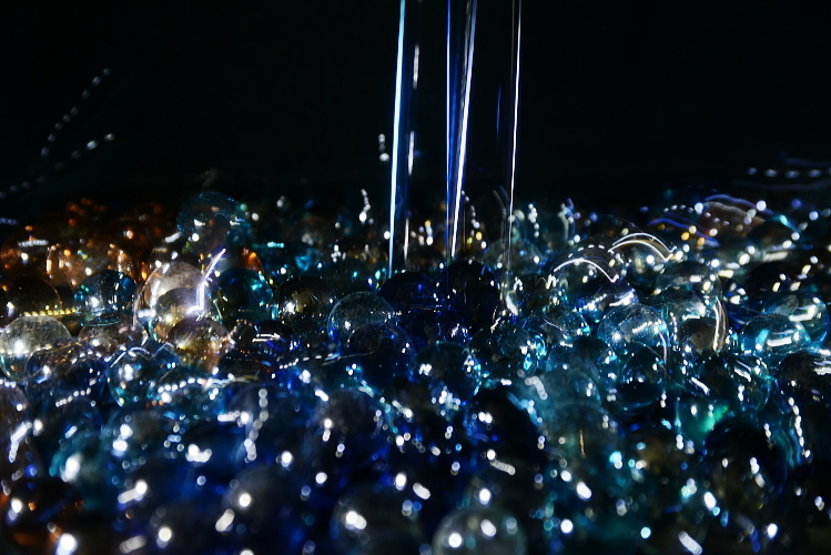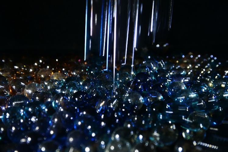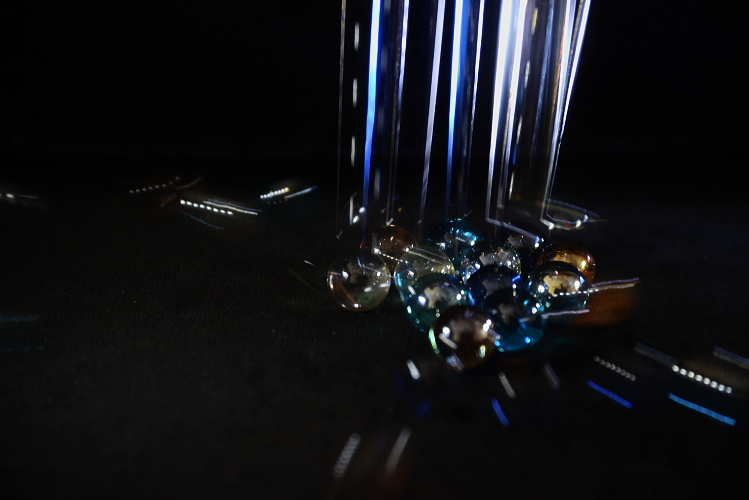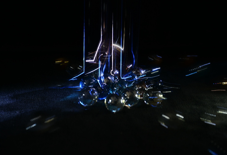 ビー玉を沢山落してみました。光跡とビー玉が激しくクラッシュします。
