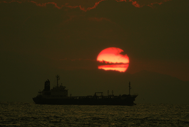 秋の伊良湖崎にて。 海峡を通る貨物船。 その上に沈もうとする太陽。 あまり見かけない風景です。