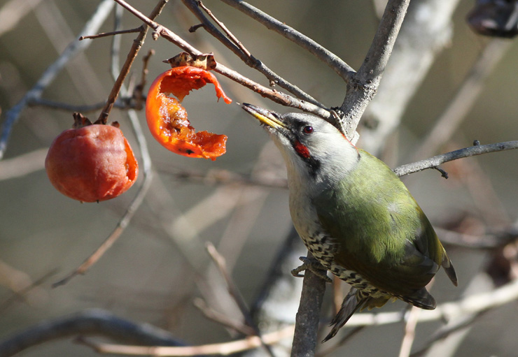 アオゲラも柿が好きです。カメラ目線なんですけど。