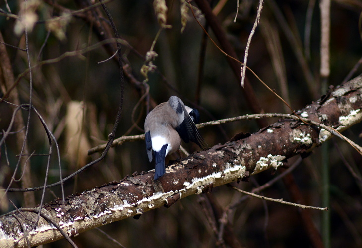これも昨年から撮り続けている鳥。ウソです。今回は雌だけですが。 羽づくろいです。