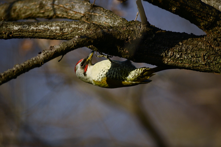 前のアカゲラと違って、このアオゲラは近かったです。トリミングしてありません。 他の鳥を狙って車の中からレンズを向けている方向の木の枝に背後から飛びこんできました。距離10m無かったかもしれません。アオゲラはでっかいですね。