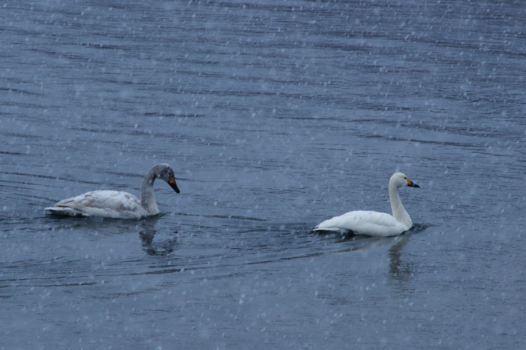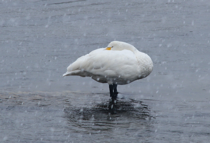 その日は関東では珍しくかなり雪が降りました。その中荒川のコハクチョウの姿を見に行きました。北国育ちのコハクチョウですが、やはり寒そうでした。