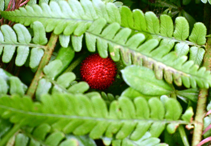 草の陰からヘビイチゴの赤い実が覗いていました。