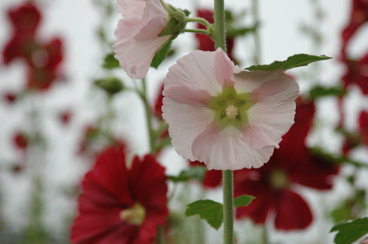 よく道脇や田畑の縁に咲いているタチアオイ。古くに薬として入ってきたらしい。ちょっと日本離れした姿ですね。バックは刈り取り前の麦畑です。