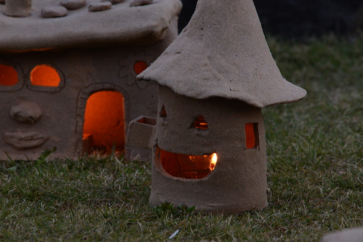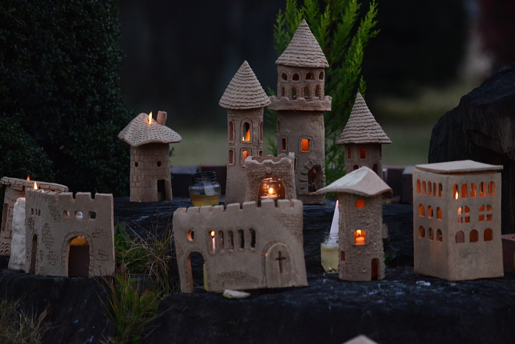 明り祭りが始まりました。まだ昼の光が残っているので年度の造形物の蝋燭の明かりも目立ちませんが。