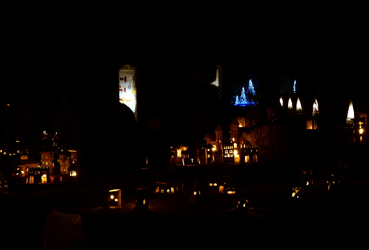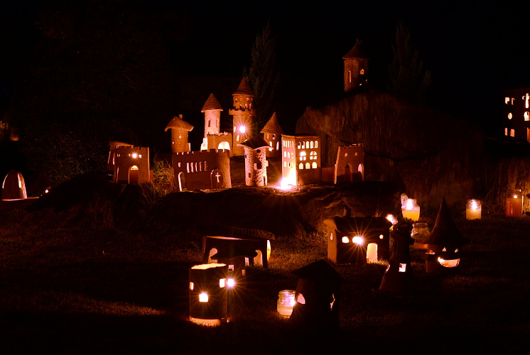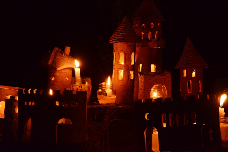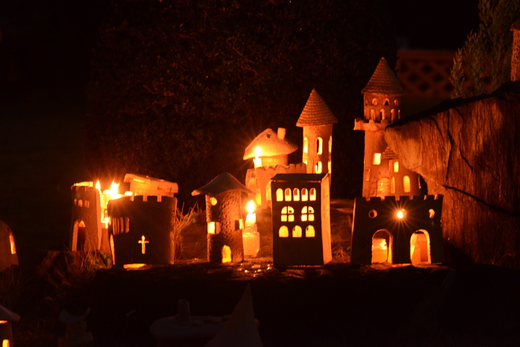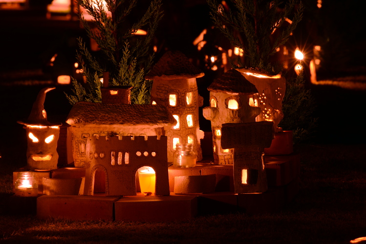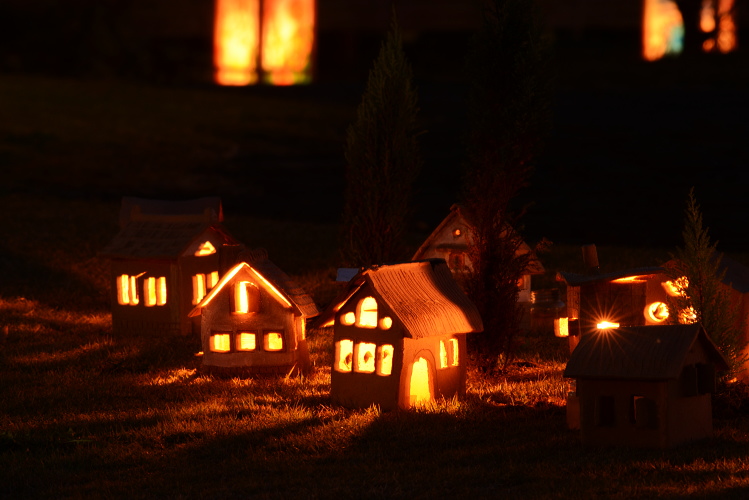 西洋風の建物の形の陶器に明かりが入り、どこか田舎の夜の感じが素敵でした。