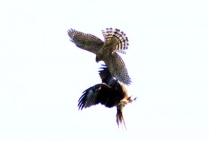 若いオオタカとトビのバトルです。と言っても本気ではやりませんよ。どちらも傷つくのは避けたいですから。