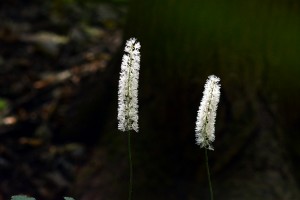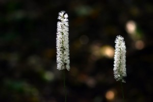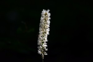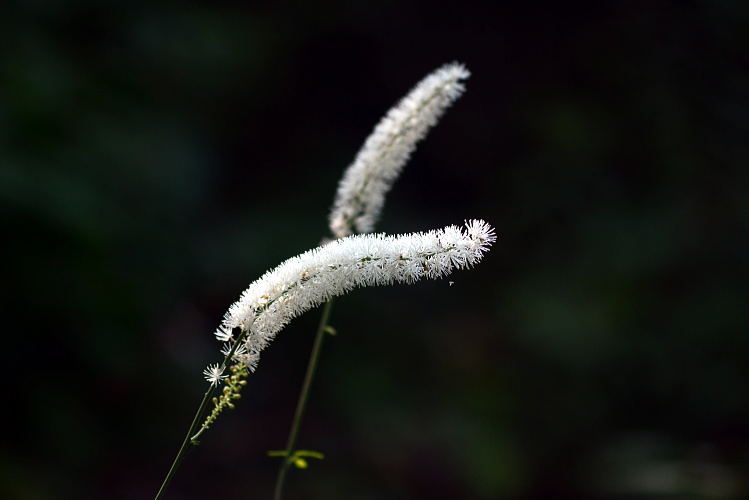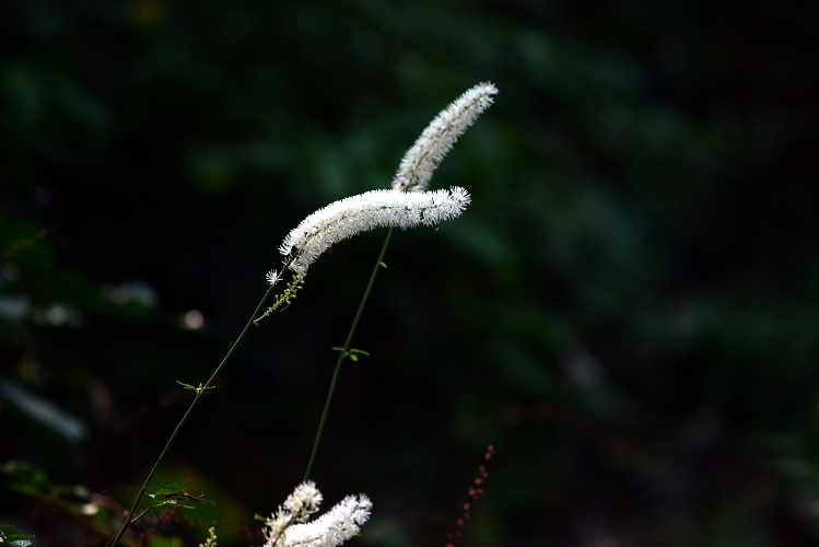 秋の紅葉前の暗い山の森の中に咲く白いサラシナショウマは、どこか妖しげな雰囲気を持っています。