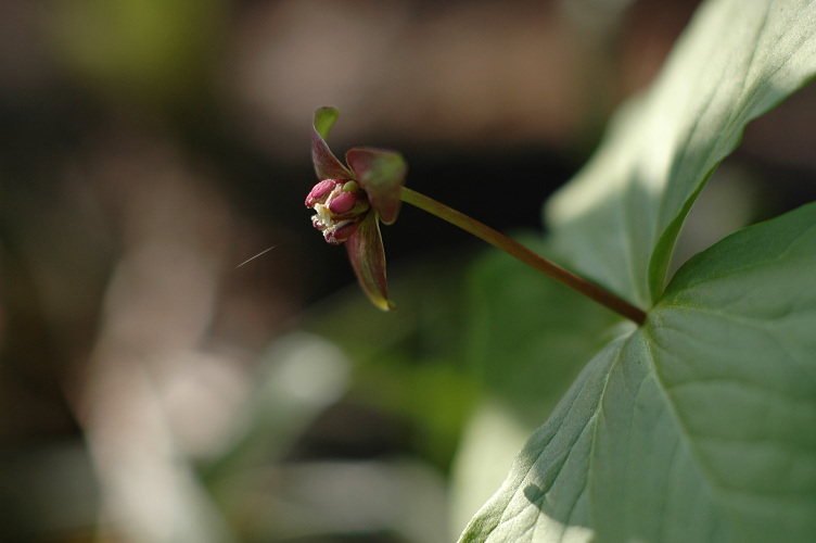 エンレイソウは変わった花ですね。 大きな三枚の葉の中心から花茎を立てるのも・・・・ 花の色も・・・・