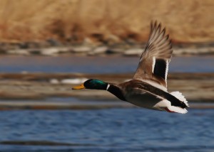 マガモの飛んでいるところの写真です。 飛翔というにはちょっと重たげですね。 これで長距離を渡るのですから凄いです。