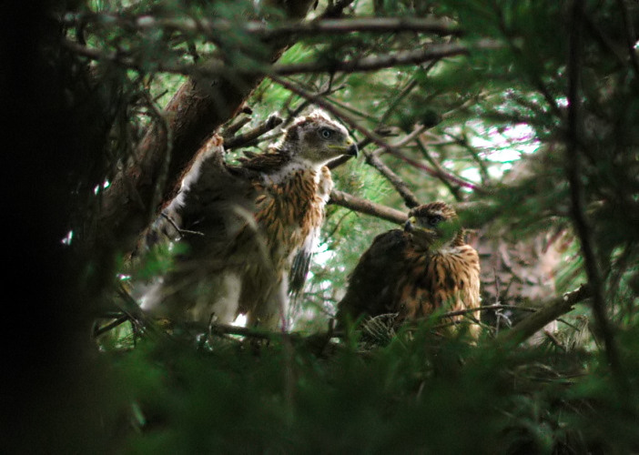 白い毛からだいぶ茶色い毛に生え変わったオオタカの雛。 しかし、巣立つのは後10日ほどかかるでしょうか。