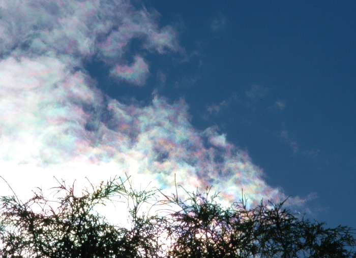 彩雲または瑞雲とも言います。 太陽の近くにある白い雲が、光の屈折によって虹色に見えて綺麗です。