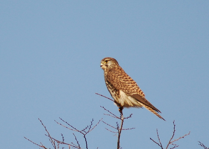 このチョウゲンボウはかなり広い場所にポツポツと立つ木のてっぺんにとまっていました。 そんな見晴らしのいい場所ですので、逆に近づくのは難しい。 静かに車で近づき、そっと撮りました。