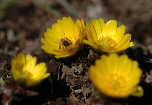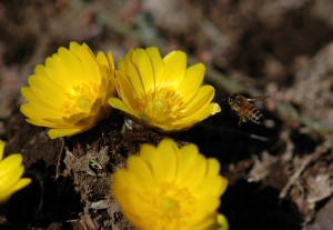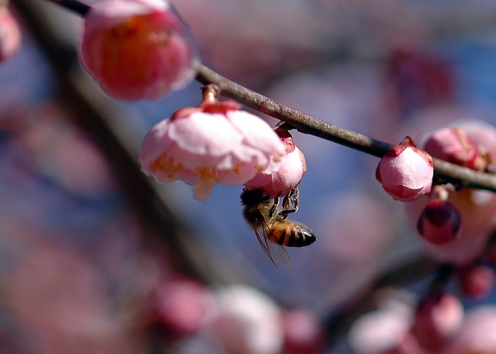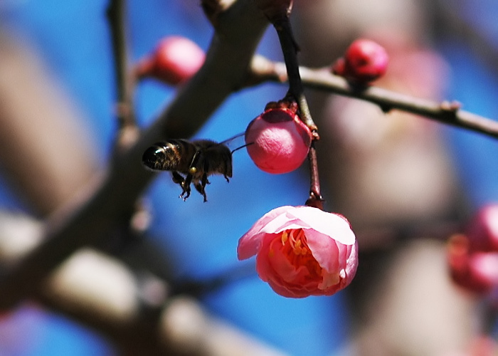 春まだ早い、いやまだ冬と言ってもいい時期です。早くに咲く梅とフクジュソウにミツバチがやってきました。