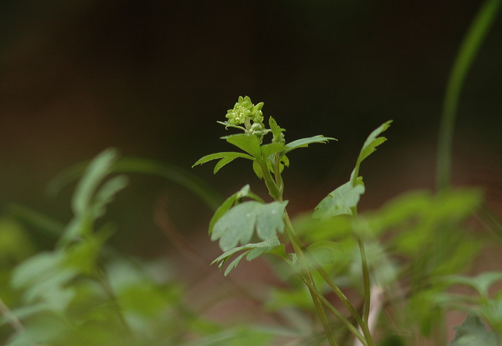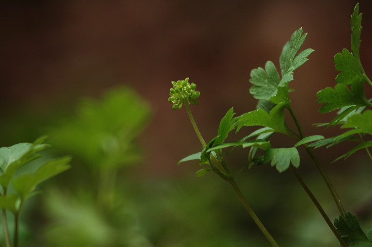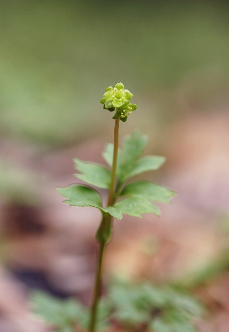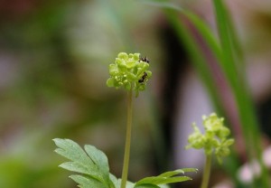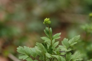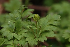 レンプクソウはまるで目立たない花です。だって、花が葉と同じ緑色ですから。でも、よく見ると面白い花ですよ。てっぺんに一輪。その周囲をサイコロのように囲んで四輪。変ですね~。